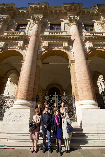Left to right, front to back: Ilaria Abbondandolo (Palladio Museum), Luca Mori (Pisa University), Olimpia Niglio (Pavia University) , Mirako Muramatsu (Tokyo University), Aynur Ciftçi (Yildiz Technical University), Marta Morelli (MAXXI), Sophie Draper (RIBA), Silvia Fogato (Palladio Museum) in front of Loggia del Capitaniato by Palladio.